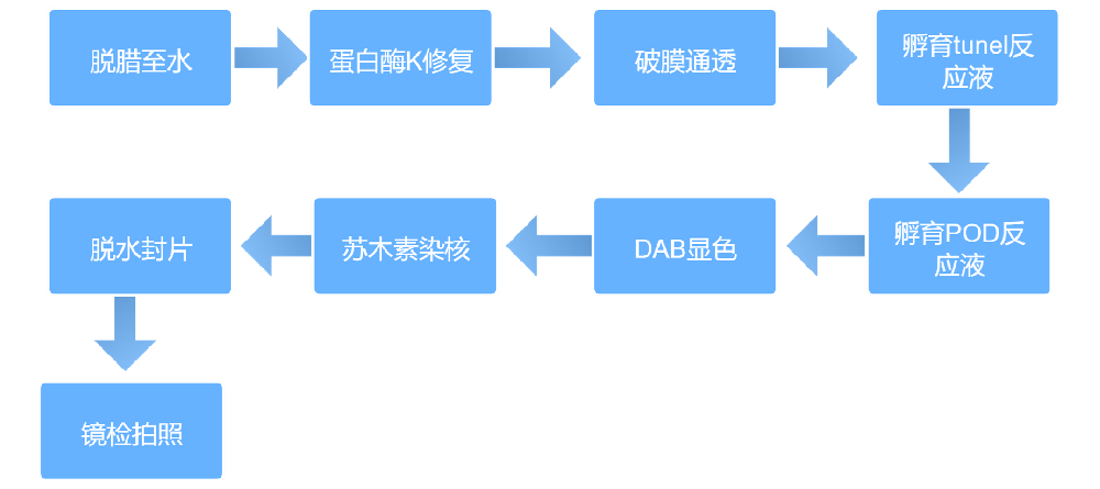 Tunel染色即原位末端转移酶标记技术。凋亡细胞的DNA双链断裂或一条链出现缺口,产生一系列3’-OH末端,在脱氧核糖核苷酸末端转移酶(TdT)作用下,将脱氧核糖核苷酸和生物素所形成的衍生物标记到DNA的3′末端,从而进行凋亡细胞的检测。TUNLE染色是分子生物学与形态学相结合的研究方法,对完整的单个凋亡细胞核或凋亡小体进行原位染色,能准确的反应细胞凋亡最典型的生物化学和形态特征。